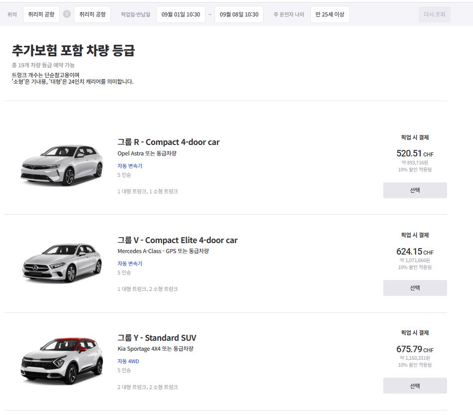 2025년 스위스 렌터카 요금 안내드립니다.