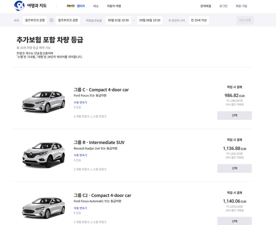 | 오토 | 그룹 C2 - Compact 4-door car | 1,140.06 EUR |