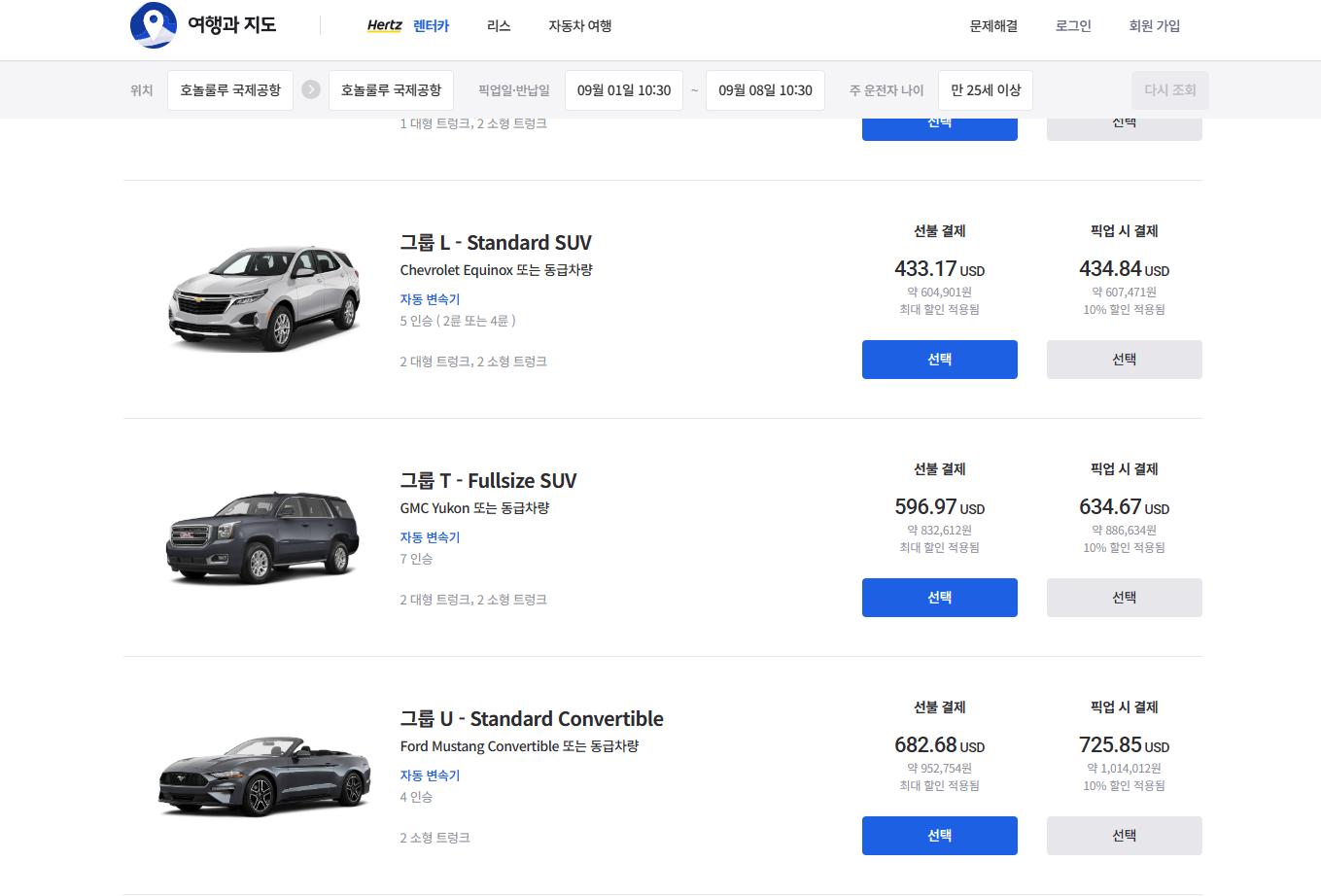 | 그룹 L - Standard SUV | 433.17 USD | 434.84 USD |