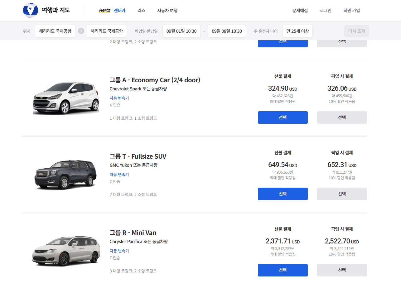 | 그룹 D - Standard Car (2/4 door) | 269.77 USD | 271.14 USD |