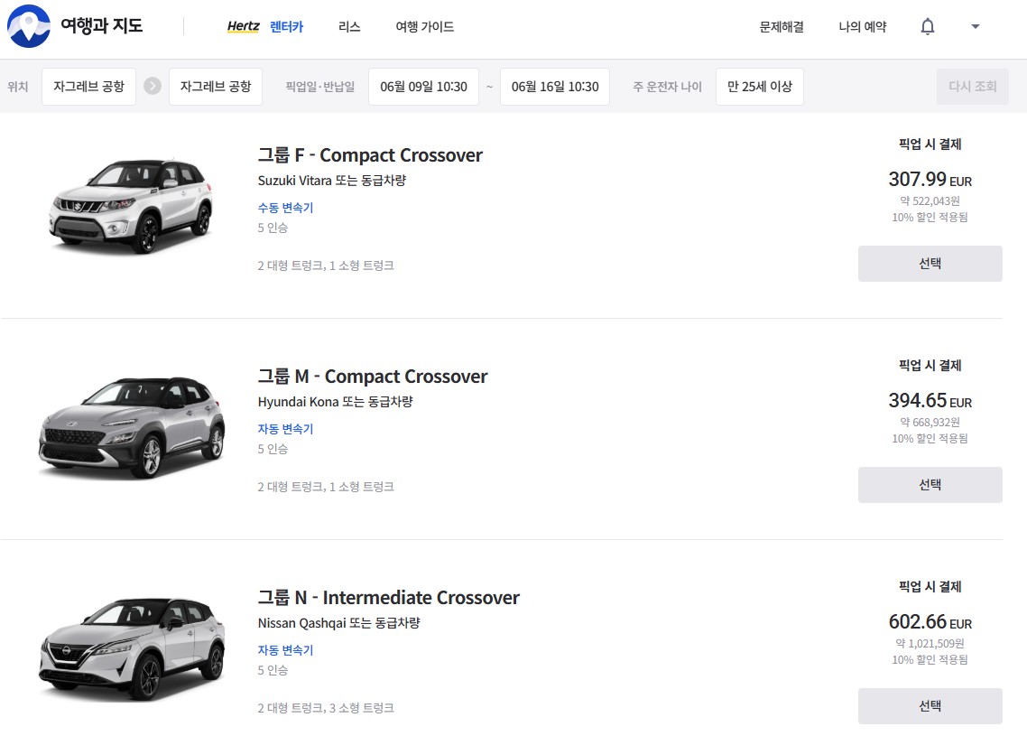 2026. 6. 9 - 2026. 6. 10 (1일) 자그레브 공항 픽업/반납 기준: