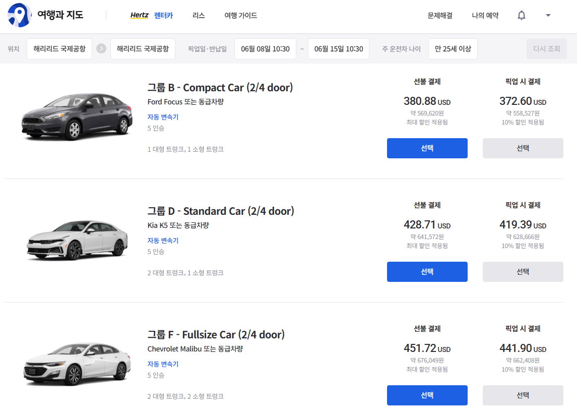 | 그룹 F - Fullsize Car (2/4 door) | 451.72 USD | 441.90 USD |