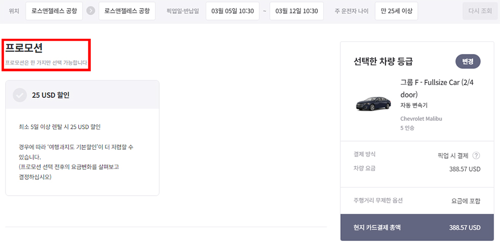 프로모션 선택 후 '현지 카드결제 총액' 금액 변화를 꼭 확인해주세요