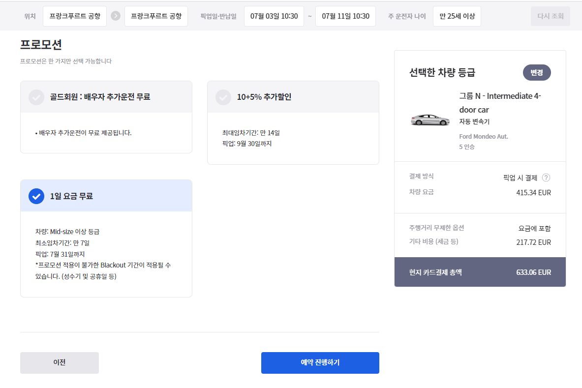 유럽렌트카 10+5% 추가할인, 1일 요금 무료 프로모션